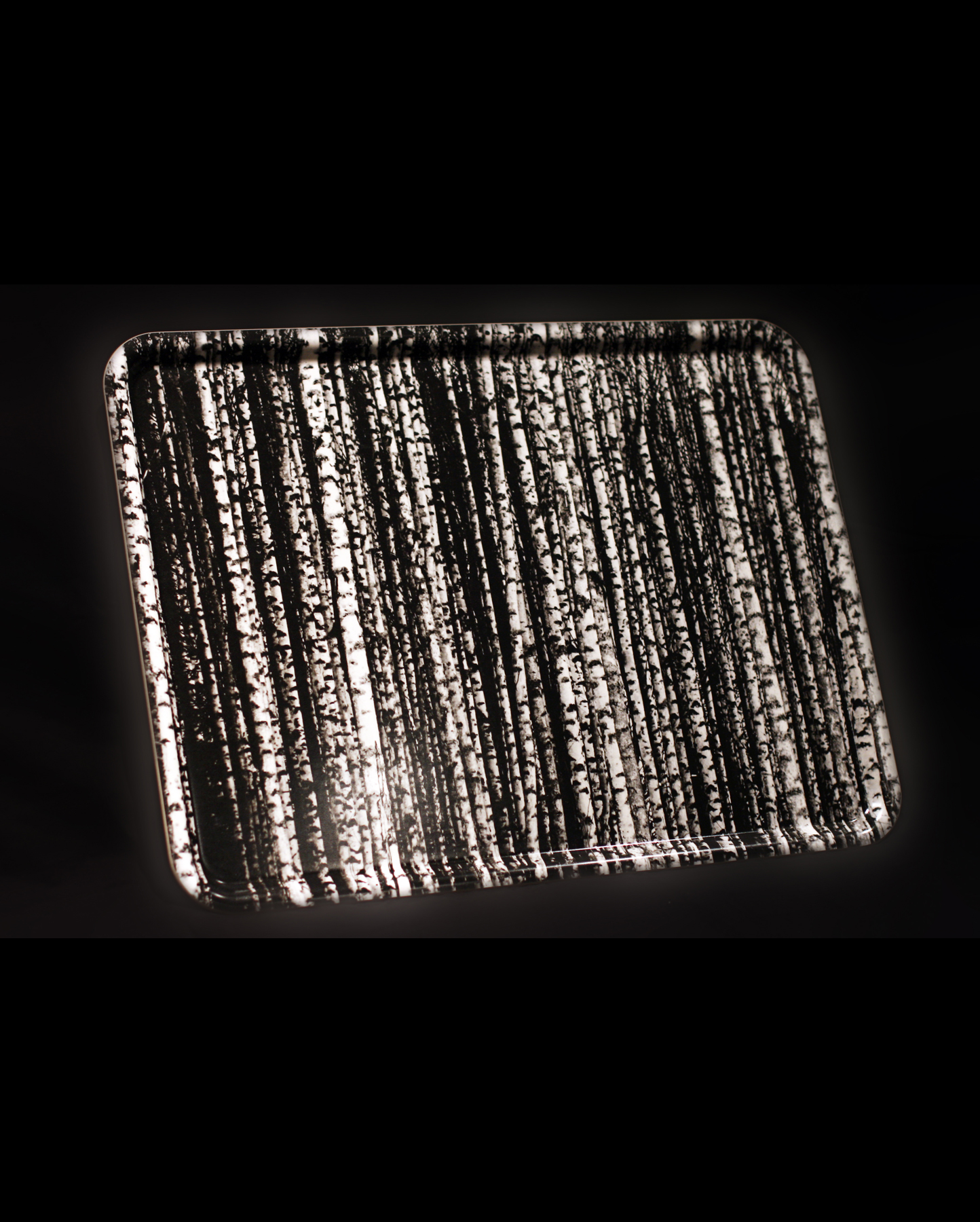 A beautiful, large, high quality tray made of Finnish birch, with a stunning black and white forest print.