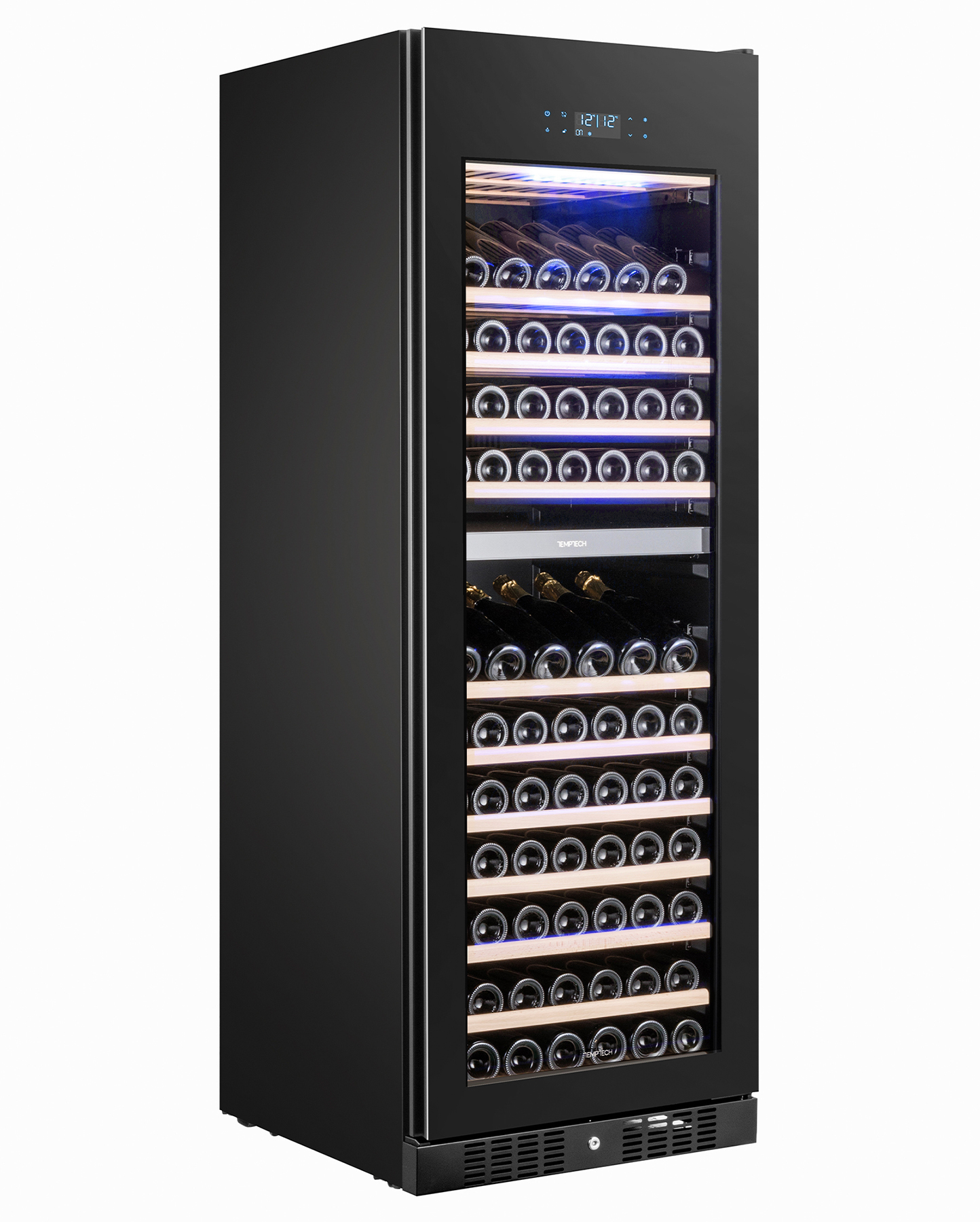 Elegantti, suuri viinikaappi kahdella lämpötilavyöhykkeellä jossa tilaa jopa 150 pullolle.