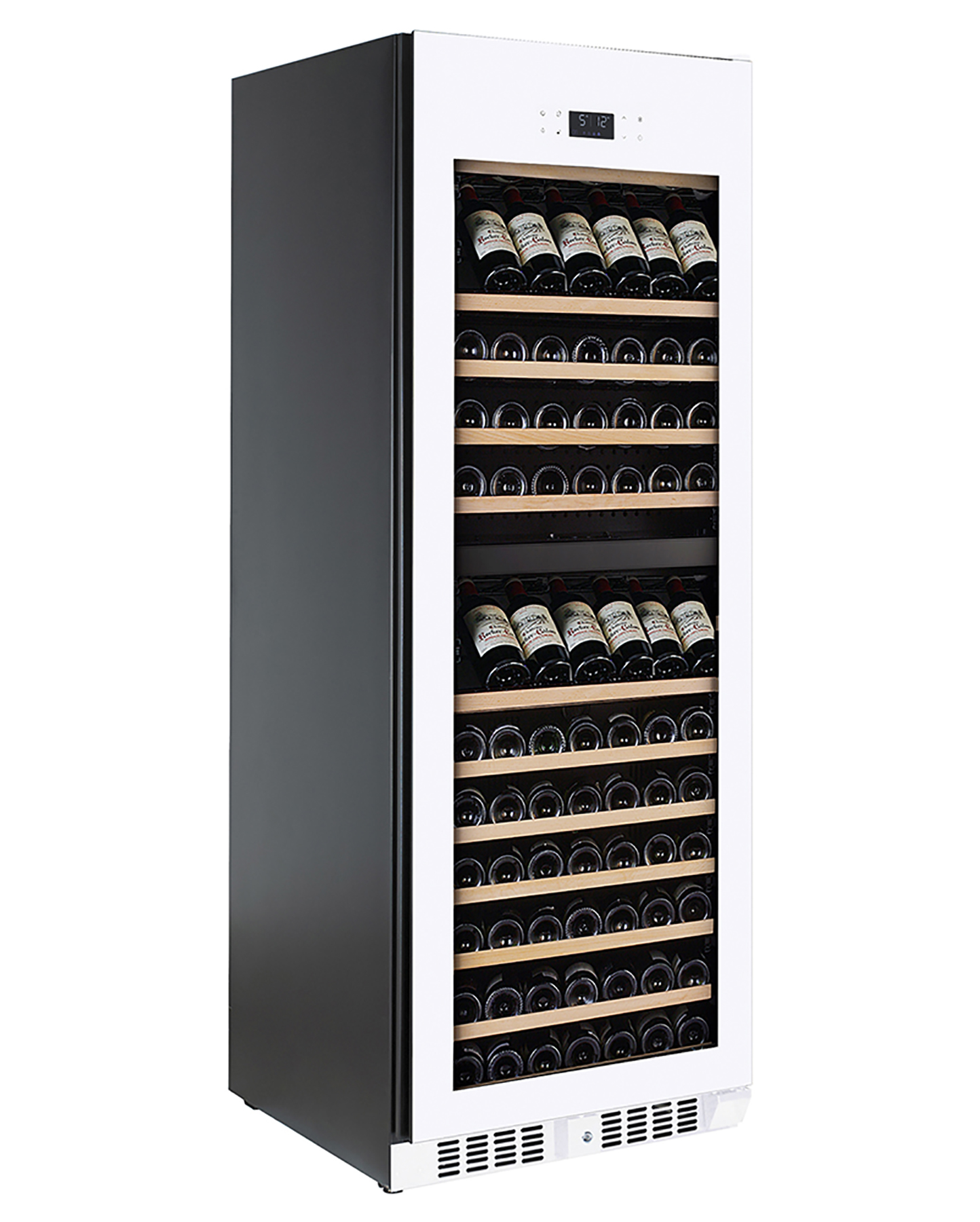 Elegantti, suuri viinikaappi kahdella lämpötilavyöhykkeellä jossa tilaa jopa 150 pullolle.