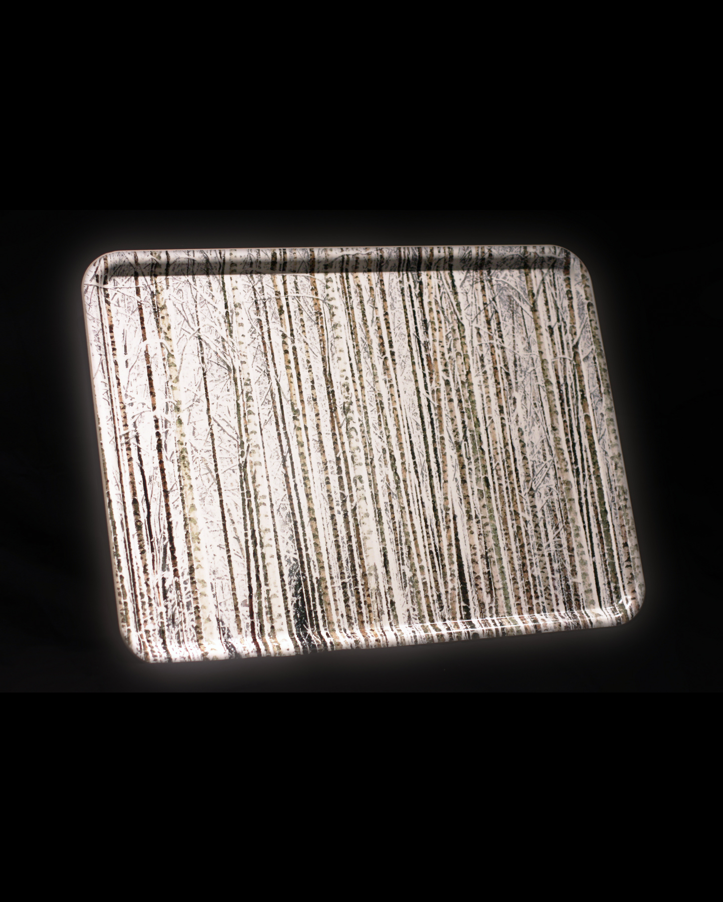 Jättitarjotin. Kaunis ja kätevä designtarjotin, joka on tehty suomalaisesta koivusta muotoon puristamalla. Isokokoisella tarjottimella on helppo kuljettaa isompiakin määriä astioita ja laseja kerralla. Sopii kovaan käyttöön tai kauniiksi sisustuselementiksi. Talvinen, valkoinen koivumaisema.