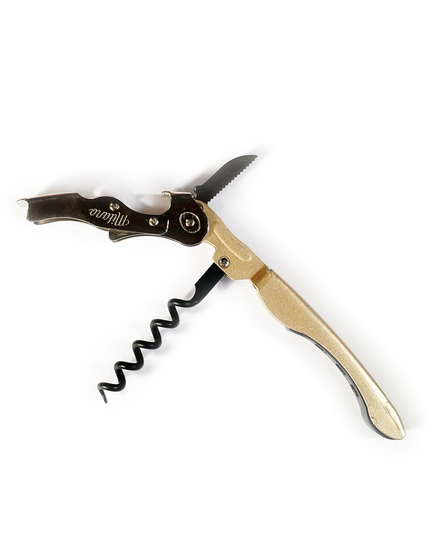 Patentoidun kaksoissaranajärjestelmän avulla voit poistaa nopeasti korkit, vaikka ne olisivat erityisen pitkiä (jopa 50 mm), hieman vaurioituneita tai märkiä. Korkkiruuvimme on varustettu myös terävällä pullonavaajaterällä, jota voidaan käyttää pienenä veitsenä pullon