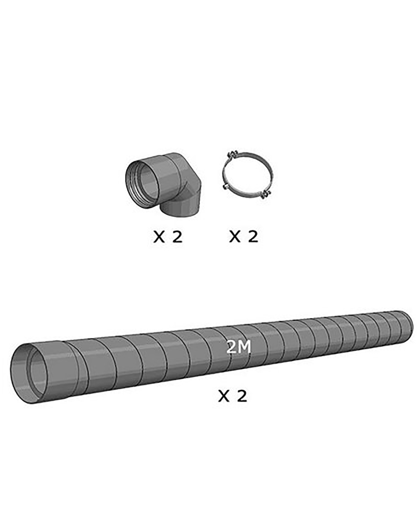 Lisävarusteena on saatavana putkiasennussarjasarja IN50 X:lle, joka sisältää kaksi 2 metriä pitkää kanavaa sekä kaksi tukipuristinta ja kaksi suorakulmaista kyynärpäätä. Katso kuva.