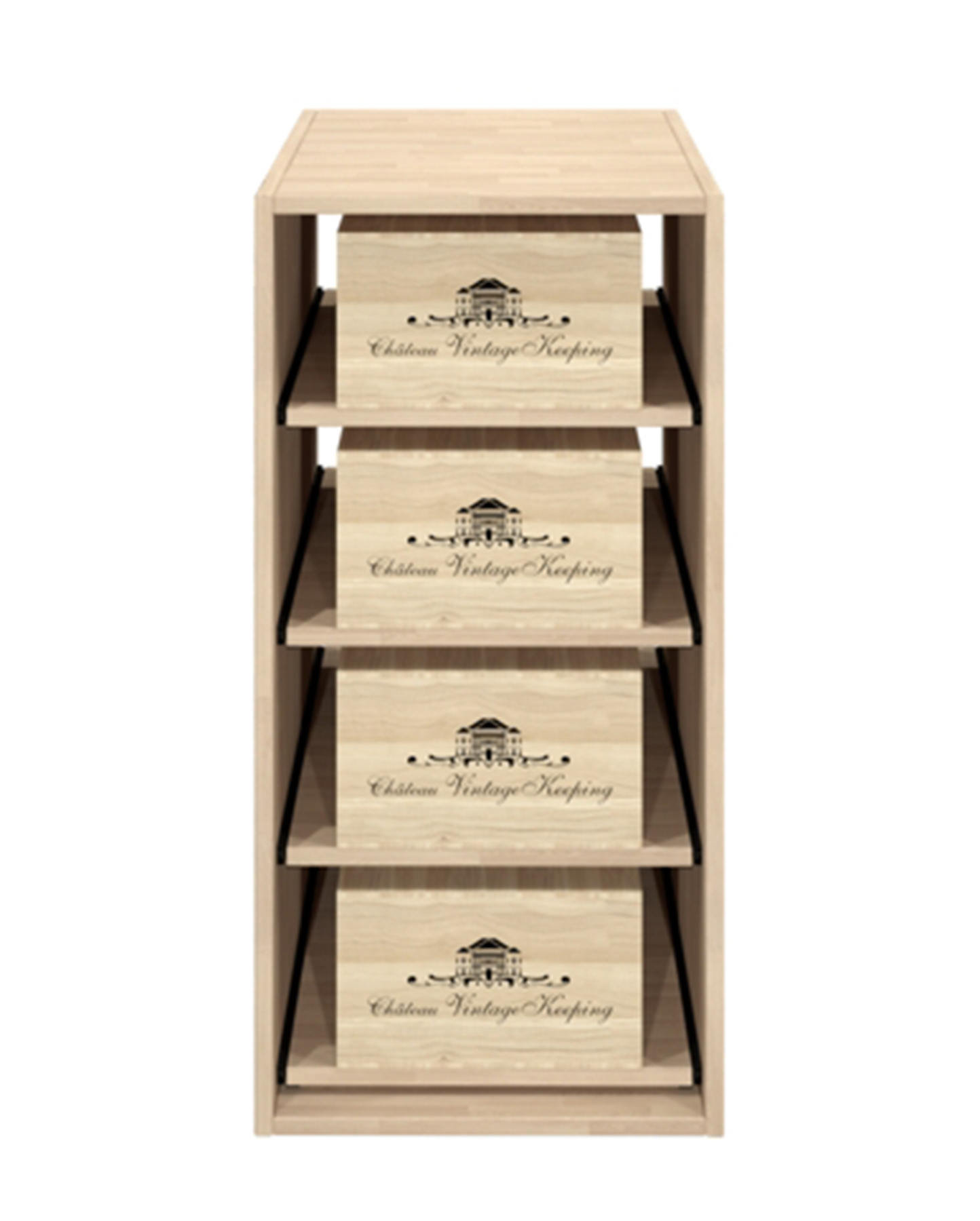 Tyylikäs viinipullohyllymoduli ulosvedetävillä hyllyillä, johon mahtuu 4kpl 12 pullon viinipullolaatikkoa. Sopii käytettäväksi erillisenä tai osana isompaa Qbic-viinihyllykokonaisuutta.