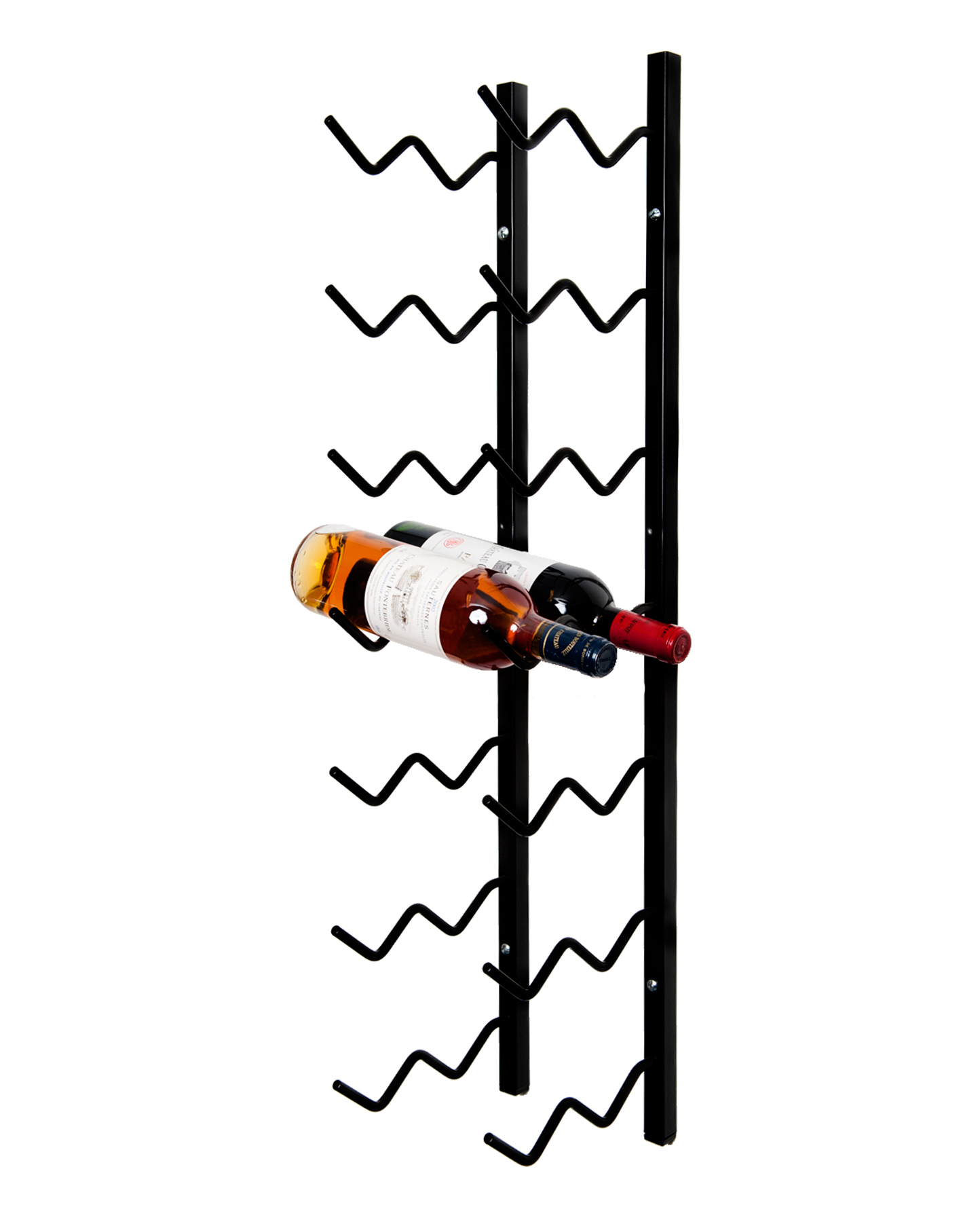 Monikäyttöinen ja näyttävä seinään kiinnitettävä viinipulloteline. Pullot ovat näyttävästi esillä vaakatasossa ja etiketit ovat helposti luettavissa.